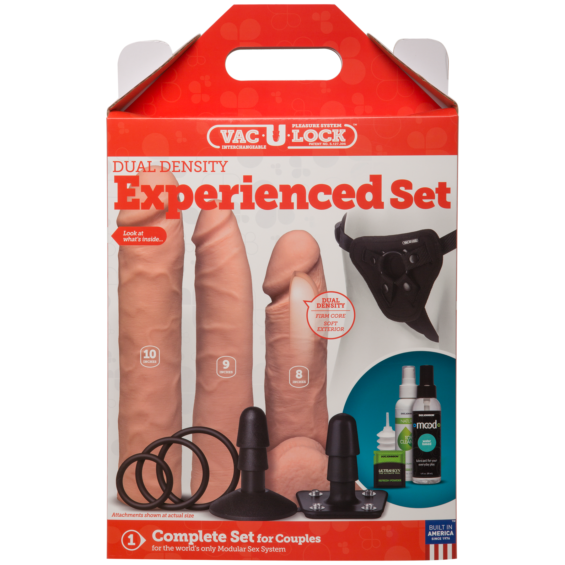 Tu experiencia strap-on perfecta está asegurada con la línea de lujo de Doc Johnson de juegos de arnés Vac-U-Lock™ de servicio completo. El Vac-U-Lock™ Dual Density Experienced Set es una excelente opción para los jugadores experimentados de strap-on y aquellos acostumbrados a una penetración más profunda. Un arnés completo con juntas tóricas extraíbles y tapón, tres accesorios ULTRASKYN™ de doble densidad, y una botella de lubricante a base de agua Mood hacen que un intenso jugueteo con correa sea tan fácil como 1-2-3. Con el efecto de doble densidad - un exterior suave y flexible que da paso a un núcleo interior firme - en material realista que se calienta al tacto, los accesorios realistas en tamaños de 8, 9 y 10 pulgadas imparten una sensación fuerte y realista. Los accesorios se pueden utilizar con el arnés, la ventosa Vac-U-Lock™ incluida y cualquier otro accesorio o arnés de la línea. El Vac-U-Lock™ Dual Density Experienced Set también incluye Doc Johnson® Natural Toy Cleaner y ULTRASKYN™ Refresh Powder para mantener adecuada e higiénicamente sus accesorios ULTRASKYN™ de doble densidad. Cada producto del sistema patentado Vac-U-Lock™ está diseñado para ayudarte a crear cualquier strap-on o juguete que te apetezca, y es tan sencillo como colocar el accesorio de tu elección.