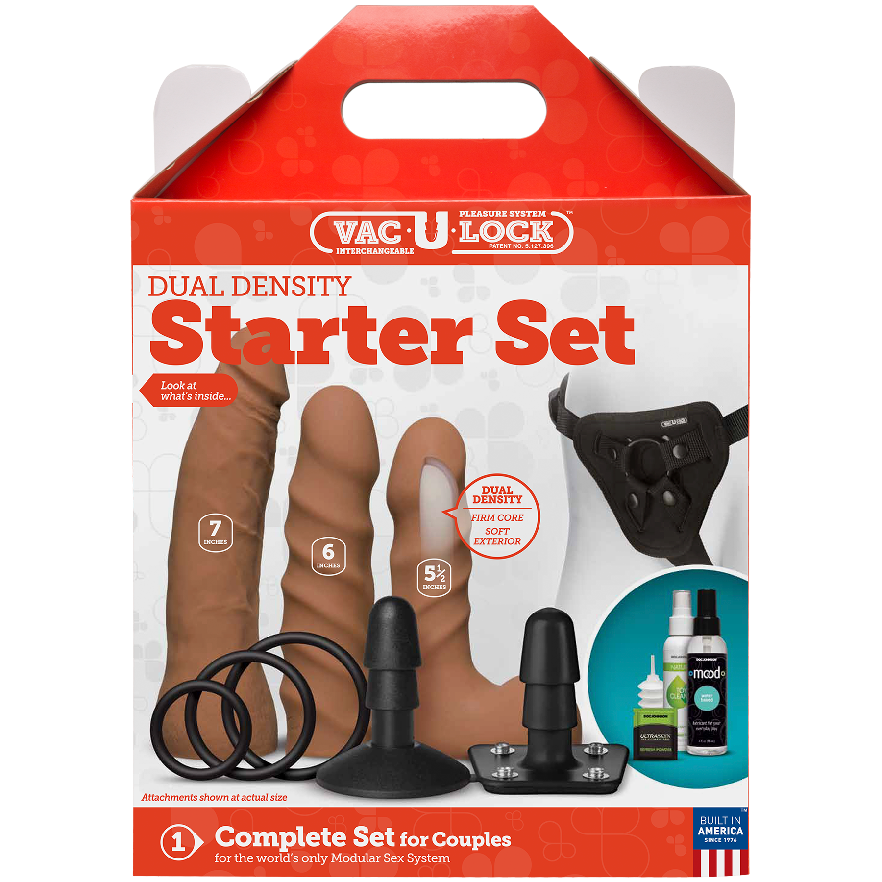 Tu experiencia strap-on perfecta está asegurada con la línea de lujo de conjuntos de arnés Vac-U-Lock™ de Doc Johnson. El Vac-U-Lock™ Dual Density Starter Set proporciona una introducción divertida e innovadora al sexo con arnés con juntas tóricas extraíbles y tapón, tres accesorios ULTRASKYN™ de tamaño moderado y una botella de lubricante Mood a base de agua. Estos accesorios de doble densidad se calientan a la temperatura corporal con el uso y cuentan con un exterior suave y flexible que da paso a un núcleo interior firme, recreando la sensación de un pene erecto real. Comience su exploración con las agradables crestas y bolas de felpa del pene texturizado de 5,5 pulgadas, o vaya un poco más profundo con el dong en espiral de 6 pulgadas. Para la sensación más fuerte y realista, elige el dong fino de 7 pulgadas de proporciones realistas, contornos y detalles de las venas. Los accesorios se pueden utilizar con el arnés, la ventosa Vac-U-Lock™ incluida y cualquier otro accesorio o arnés de la línea. El Vac-U-Lock™ Dual Density Starter Set también incluye Doc Johnson® Natural Toy Cleaner y ULTRASKYN™ Refresh Powder para mantener adecuada e higiénicamente sus accesorios ULTRASKYN™ de doble densidad. Cada producto del sistema patentado Vac-U-Lock™ está diseñado para ayudarte a crear cualquier strap-on o juguete que te apetezca, y es tan sencillo como colocar el accesorio de tu elección.